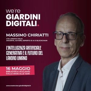 Massimo Chiriatti è uno dei principali esperti italiani nel campo delle tecnologie emergenti. Attualmente ricopre il ruolo di chief Technology and innovation officer nella Lenovo Italia, dove guida la strategia aziendale su temi chiave come intelligenza artificiale, blockchain e innovazione sostenibile. Ha maturato una significativa esperienza anche in Ibm, dove ha ricoperto incarichi strategici nello sviluppo di soluzioni digitali enterprise, contribuendo a importanti progetti di trasformazione tecnologica in ambito industriale. È Adjunct professor all’Università Cattolica del Sacro Cuore e alla Luisa, dove si occupa di formare le nuove generazioni sui temi dell’etica digitale, della governance tecnologica e del futuro del lavoro. È autore di due saggi: #Humanless – L’algoritmo egoista (Hoepli, 2019, e Incoscienza artificiale – Come fanno le macchine a prevedere per noi (Luiss University press, 2021.