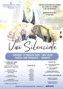 Giovedì 22 maggio alle 19.30 nella chiesa di San Pasquale, a Taranto, si terrà concerto in ricordo delle vittime del lavoro, del dovere e del volontariato dal titolo ‘Voci silenziate’ a cura del conservatorio Giovanni Paisiello.
