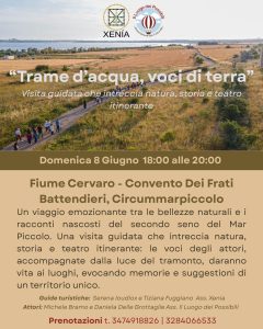 Domenica 8 giugno dalle ore 18 alle 20, Serena Ioudiox e Tiziana Fuggiano dell’associazione Xenia aps insieme a Daniela Delle Grottaglie e Michele Bramo dell’associazione Il Luogo dei Possibili daranno vita a ‘Trame d’acqua, voci di terra’, un viaggio emozionale tra le bellezze naturali e i racconti nascosti del secondo seno del Mar piccolo.
