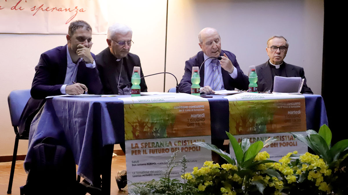 Il convegno conclusivo, sul tema “La speranza cristiana per il futuro dei popoli”, si è svolto martedì 3 giugno, nell’auditorium San Roberto Bellarmino. I sentiti ringraziamenti dei corsisti sono andati a don Antonio Rubino, vicario episcopale per la Cultura, che si è prodigato per l’organizzazione del corso, e al prof. Lino Prenna, docente universitario, che ha condotto gli incontri con professionalità e dedizione.