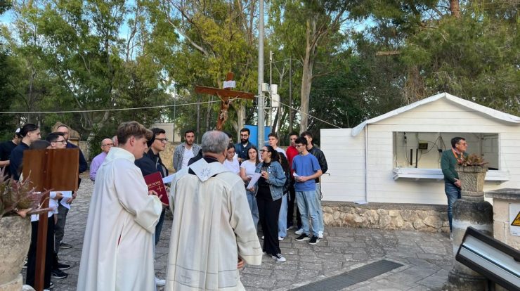 Subito dopo, i giovani hanno compiuto il simbolico passaggio attraverso la porta giubilare del santuario, gesto di conversione e di rinnovamento spirituale, che li ha introdotti nel cuore della veglia. L’animazione del momento di preghiera è stata affidata ai giovani della parrocchia del Carmine di Grottaglie, che con le loro voci hanno creato un clima di raccoglimento e partecipazione.
