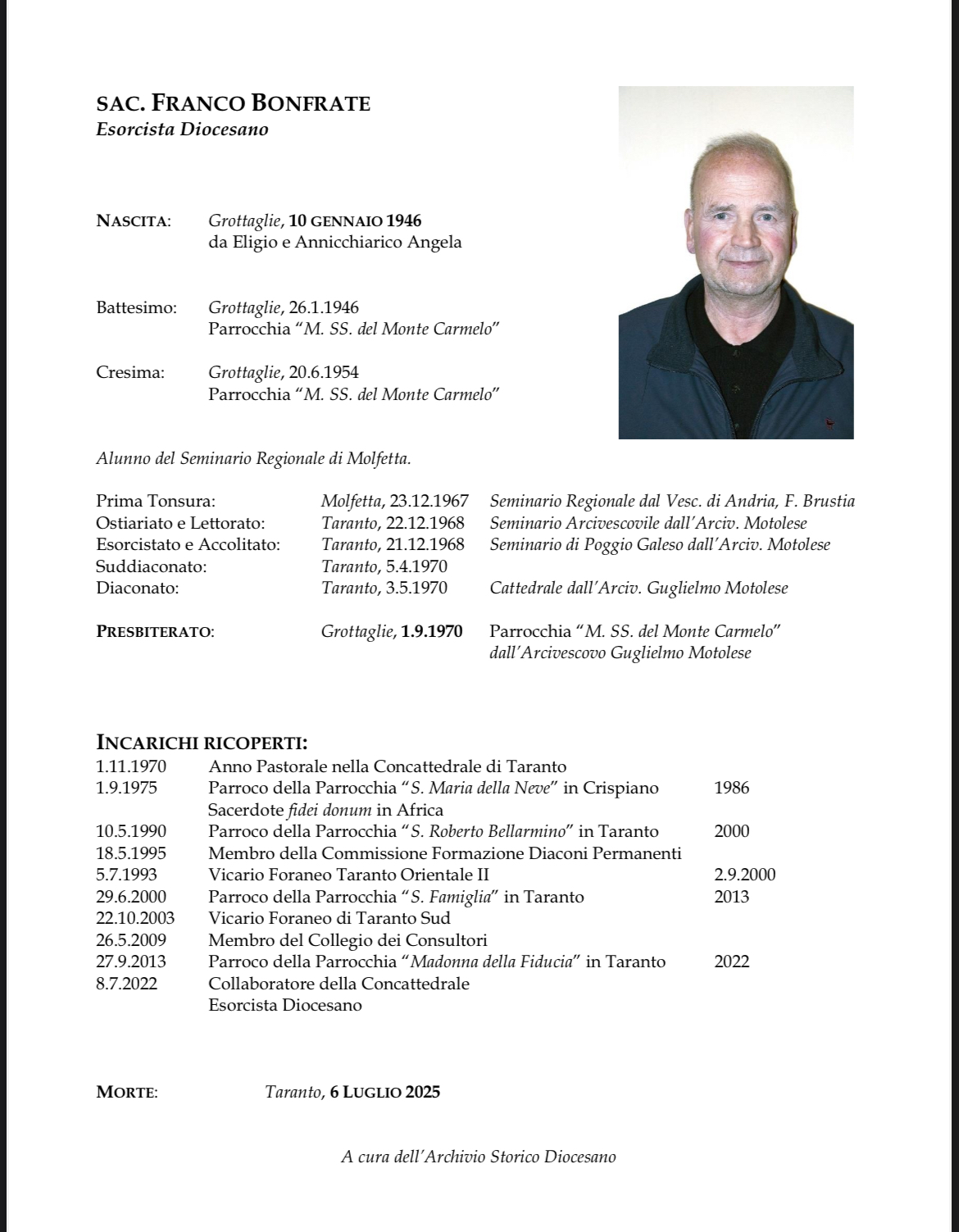 Nato a Grottaglie nel 1946, era stato ordinato sacerdote nel 1970. Don Franco ha svolto per molti anni l’incarico di Esorcista Diocesano. La comunità diocesana esprime il suo cordoglio affidandolo con la preghiera a Gesù Buon Pastore perché lo accolga nella Sua misericordia infinita.