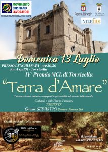 Il circolo Movimento cristiano lavoratori di Torricella annuncia la quarta edizione del Premio Mcl Torricella Terra d’amare che si terrà domenica 13 luglio alle ore 20.30 a Torricella a ‘La ’nchianata’, strada provinciale 131 – km 4, col patrocinio del presidente del Consiglio regionale, di quello della Provincia di Taranto e di importanti aziende del territorio.