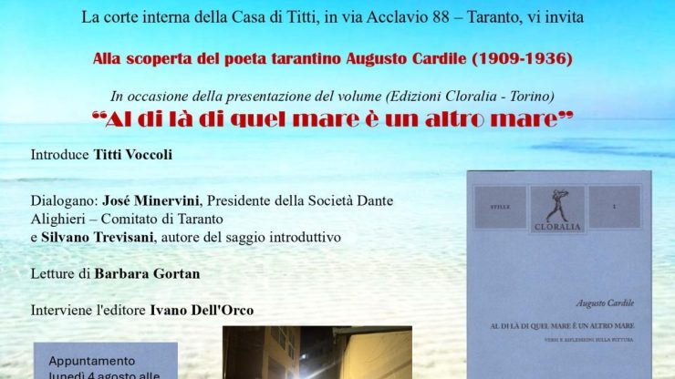 Una serata dedicata alla scoperta del poeta tarantino Augusto Cardile (1909-1936) è quella che si terrà lunedì 4 agosto alle ore 20.30 nella corte interna della ‘Casa di Titti’, in via Acclavio 88 (nei pressi del lungomare), in occasione della presentazione del suo libro dal titolo ‘Al di là di quel mare è un altro mare-Versi e riflessioni sulla pittura’ (Edizioni Cloralia-Torino).