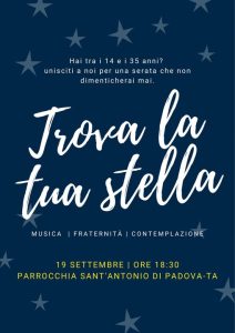 ‘Trova la tua stella’ è il titolo della iniziativa che si svolgerà venerdì 19 dalle ore 18.30 sul sagrato della chiesa di Sant’Antonio, a Taranto in via Duca degli Abruzzi, aperta a tutti i giovani dai 14 ai 35 anni che vogliono vivere una serata all’insegna dell’incontro, dell’amicizia, dalla musica, della fraternità e della contemplazione.