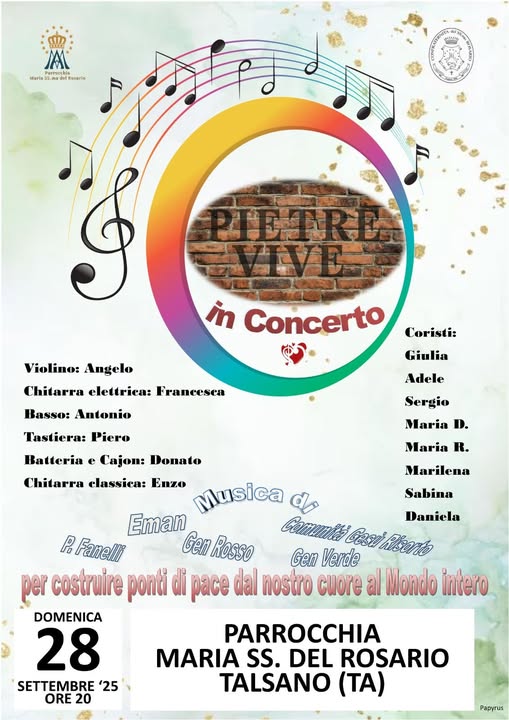 A Talsano, in apertura dei festeggiamenti in onore di Maria Santissima del Rosario, a cura della omonima parrocchia domenica 28 alle ore 20 si terrà il concerto del coro parrocchiale ‘Pietre vive’. Questo, come riferisce il parroco don Armando Imperato, “per costruire ponti di pace dal nostro cuore al mondo intero”.
