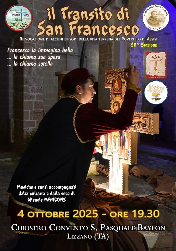 Alle ore 19.30,  nel chiostro della San Pasquale Baylon, il Transito di San Francesco sarà revocato con la rappresentazione di alcuni episodi della vita terrena del Poverello di Assisi, con musiche e canti accompagnati dalla chitarra e dalla voce di Michele Mancone.