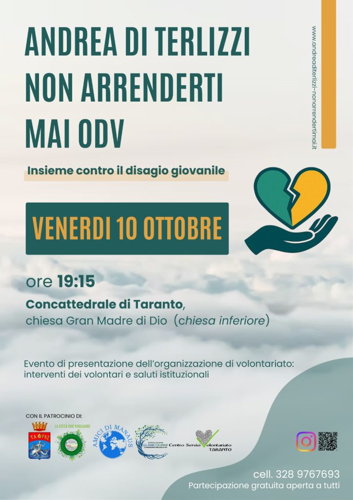 Trasformare il dolore più grande che possa provare una famiglia, quello della prematura scomparsa di un figlio, in una speranza per tanti giovani che vivono un disagio nella solitudine: con questo scopo è nata a Taranto l’associazione di volontariato ets ‘Andrea Di Terlizzi – Non arrenderti mai odv’.