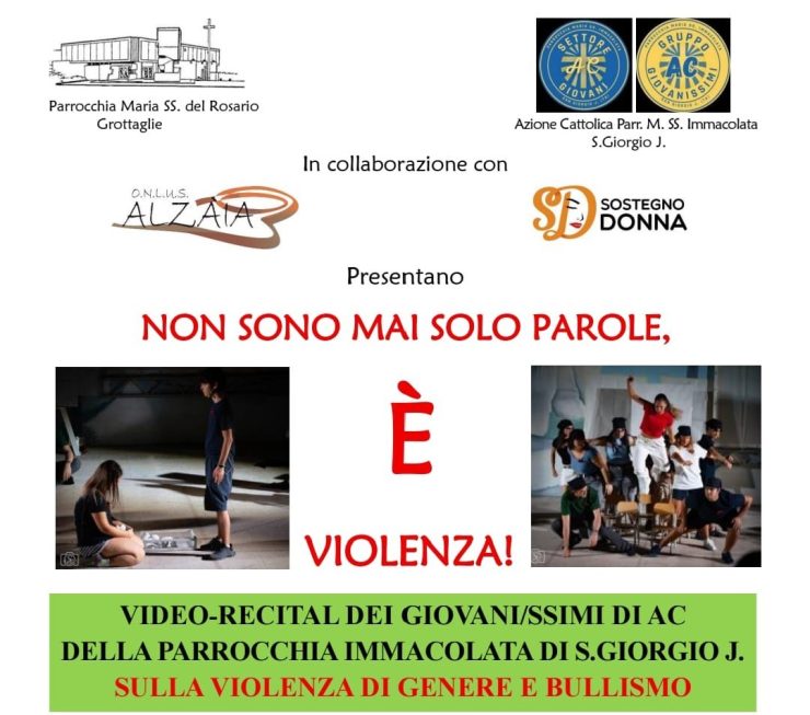 Venerdì 10 ottobre, nella Chiesa di Maria SS. del Rosario, alle ore 20, nell’ambito delle manifestazioni organizzate in occasione della celebrazione della festa della Madonna del Rosario, sarà presentato “Non sono mai parole è violenza”. Si tratta di un video-recital dei giovani di azione cattolica della parrocchia Immacolata di San Giorgio Jonico sulla violenza di genere e sul bullismo. La manifestazione, realizzata in collaborazione con Alzaia Onlus e Sostegno donna, vedrà anche un approfondimento guidato dalla psicologa Carmen Palazzo, coordinatrice dello Sportello antiviolenza “Sostegno donna” di Grottaglie.