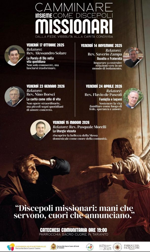 ‘Camminare insieme come discepoli missionari: dalla fede vissuta alla carità condivisa’ è il tema della serie di incontri che segneranno il cammino di catechesi comunitaria alla parrocchia del Sacro Cuore, in via Dante, a Taranto. “Ciò costituirà un’occasione preziosa per crescere insieme nella fede e riscoprire la bellezza di una comunità che ascolta, prega, si forma e serve – spiega il parroco don Francesco Venuto – Quest’anno vogliamo lasciarci guidare da u sogno semplice ma grande: vivere la fede in modo concreto e gioioso, camminare insieme come fratelli e tradurre i Vangelo on gesti di carità e speranza. Ogni incontro sarà un passo per diventare davvero Chiesa in uscita, discepoli che camminano con il cuore acceso e mani pronte a servire”.
