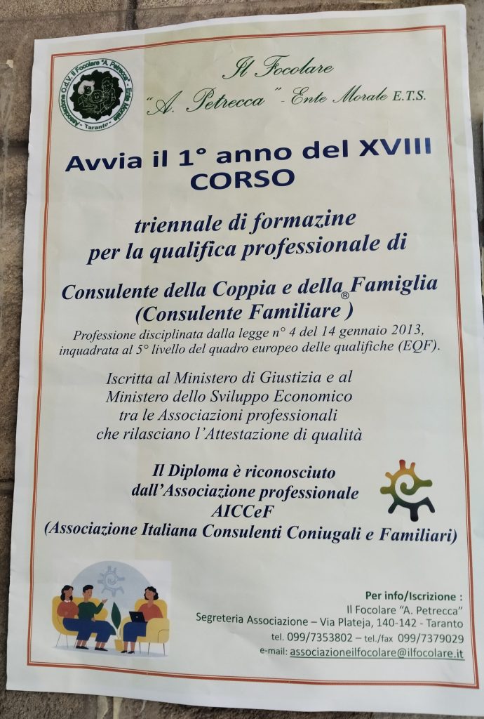 Il consultorio familiare ‘Il Focolare – A. Petrecca’ avvia il primo anno dell’8° corso triennale di formazione per la qualifica professionale di ‘Consulente della coppia e della famiglia’ (consulente familiare), professione disciplinata dalla legge n° 4 del 14 gennaio 2013 inquadrata al 5° livello del quadro europeo delle qualifiche (Eqf). Il diploma è riconosciuto dall’associazione professionale Associazione italiana consulenti coniugali e familiari.