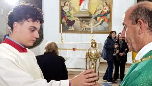 Domenica 26, durante la santa messa delle ore 10.30 consegna di un fiore bianco da parte dei bambini e del popolo di Dio e saluto alle reliquie.