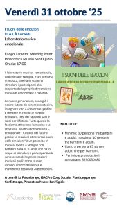 Venerdì 31 ottobre a  Taranto alle ore 17 alla pinacoteca-museo Sant’Egidio della chiesa di San Pasquale Baylon si terrà un Laboratorio musico-emozionale ‘IT.A.CÀ for kids – I suoni delle emozioni’, a cura de La Palomba aps, IsacPro coop sociale, Plasticaqqua aps, ConTatto aps, Pinacoteca-museo Sant’Egidio