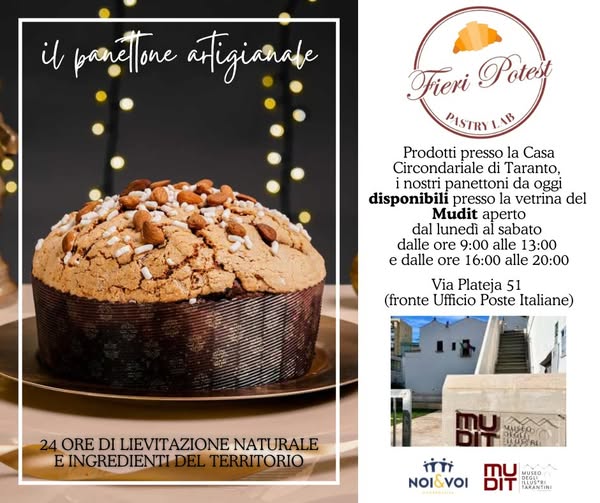 Anche quest’anno, nell’approssimarsi delle festività natalizie, è iniziata la vendita dei panettoni artigianali realizzati nel laboratorio di pasticceria Fieri potest pastry lab, attivo all’interno della casa circondariale Carmelo Magli di Taranto, disponibili nei seguenti gusti: classico, al cioccolato, all’arancio e cioccolato fondente, al mandarino e caramello salato.