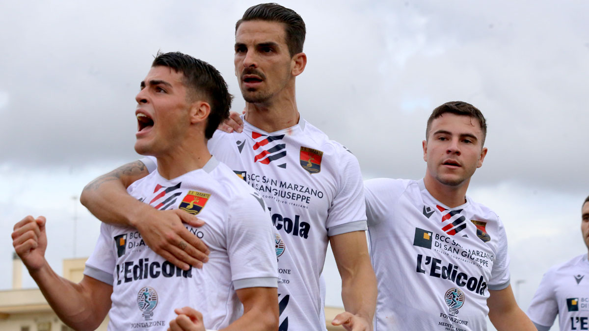 L’incontro comincia con cinque minuti di ritardo, in uno stadio gremito. Dopo soli novanta secondi sono gli ospiti a farsi pericolosi. I ritmi sono alti, la partita ruvida, godibile. I padroni di casa provano a pareggiare il conto delle occasioni. Ma per metà tempo non succede nulla. È Nicola Strambelli, anzi, al 24’ a mettere in ambasce la retroguardia ionica con un tiro dal limite che finisce di poco fuori. Tre minuti dopo la più ghiotta occasione passa dai piedi di Umberto Monetti, che da posizione favorevole spreca, però. Il Taranto attacca ancora. E al 32’ a sbloccare il risultato con un gran diagonale ci pensa Pablo Aguilera. Lo stesso attaccante spagnolo, cinque minuti dopo, fa da sponda a Francesco Losavio che di testa insacca in tuffo meraviglioso. Al 45’ Dramane Konate sfiora la terza rete e fa vivere a tutti attimi di grande apprensione: il difensore della Costa d’Avorio finisce a terra dopo aver ricevuto un colpo, esce in barella, ma torna in campo.