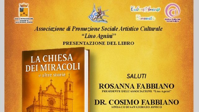 Sabato 15 novembre, alle ore 19, a San Giorgio jonico, nella suggestiva cornice del circolo culturale ‘Agnini’ sarà presentato il nuovo romanzo del giornalista e scrittore Floriano Cartanì intitolato ‘La Chiesa dei miracoli e altre storie’, opera che ha già conquistato lettori e critica per la sua intensità narrativa e la profondità dei temi trattati. A dialogare con l’autore sarà Elena Manigrasso, docente e scrittrice di spicco nel panorama letterario pugliese, che guiderà il pubblico in un confronto ricco di suggestioni, tra le pieghe di un libro che intreccia mistero, radici e fede popolare.