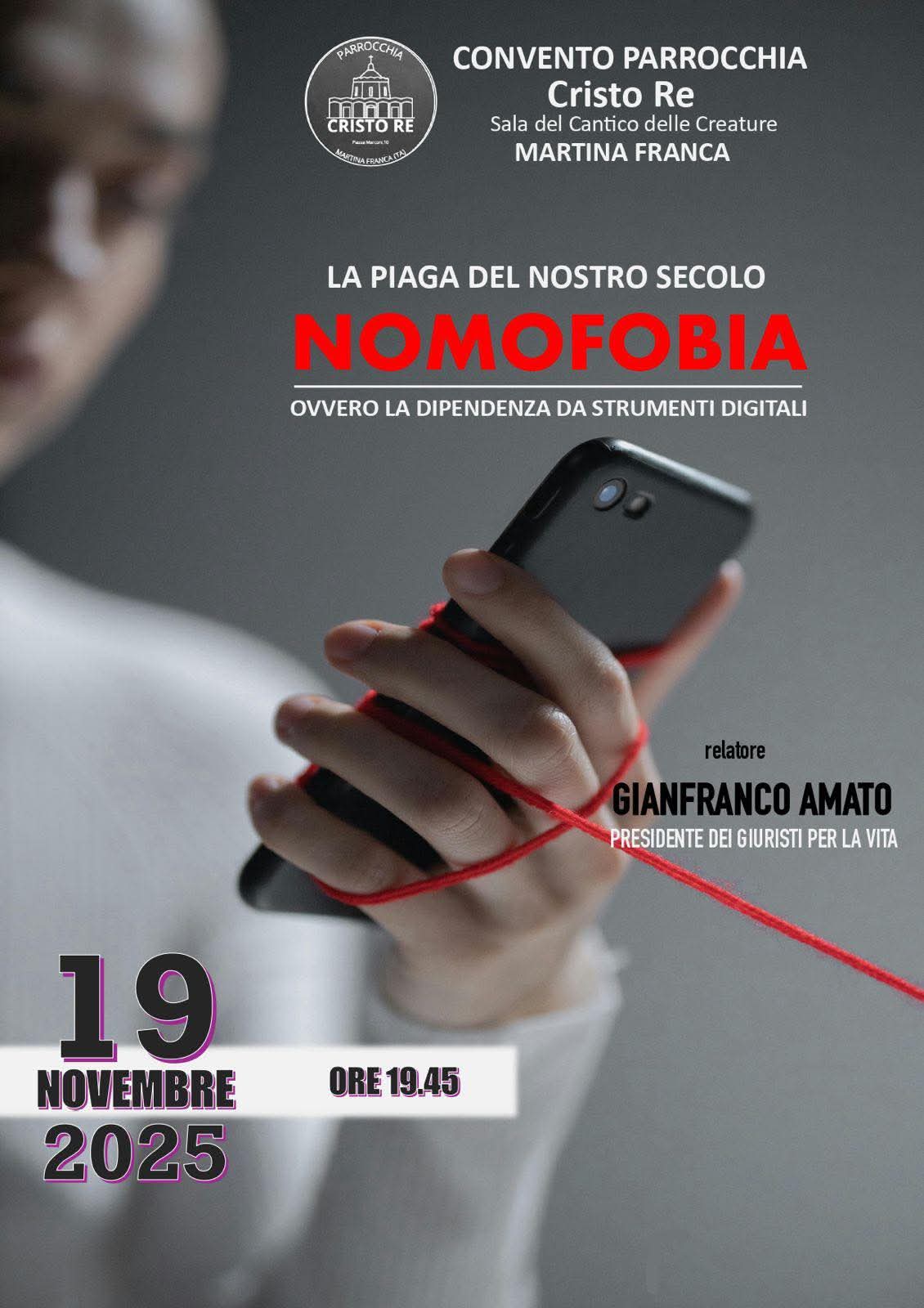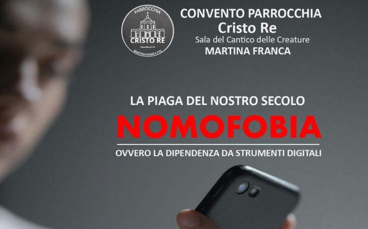 “Se il tuo smartphone è l’ultima cosa che guardi la sera e la prima che cerchi al mattino, questo incontro è per te! Scopri il lato oscuro della tecnologia e la piaga del nostro secolo: la nomofobia, cioè la dipendenza da strumenti digitali”: così il parroco della Cristo Re dei frati minori, a Martina Franca, padre Paolo Lomartire invita a partecipare all’interessante e attualissimo incontro sull’argomento che si terrà in chiesa mercoledì 19 alle ore 19.45 con il dott. Gianfranco Amato, presidente dei giuristi per la vita.
