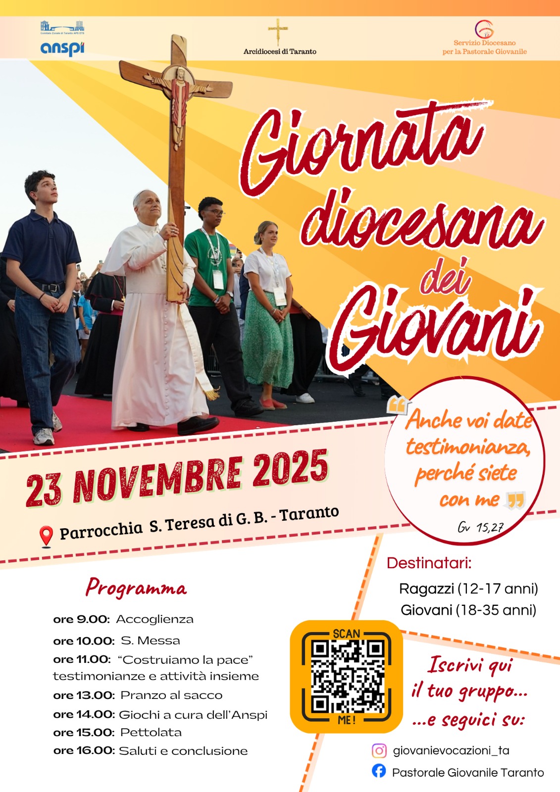La Chiesa di Taranto si prepara a vivere con entusiasmo la Giornata diocesana dei giovani, in programma domenica 23 novembre, solennità di Cristo Re, nella parrocchia Santa Teresa di Taranto, dalle ore 9 alle 16. Si tratta di un appuntamento atteso, rivolto a tutti i giovani della diocesi (gruppi parrocchiali, associazioni, movimenti, scout e studenti) dai 12 ai 35 anni, per condividere una giornata di fede, fraternità e impegno, alla luce del tema scelto da papa Leone XIV: “Anche voi date testimonianza, perché siete con me” (Gv 15,27)