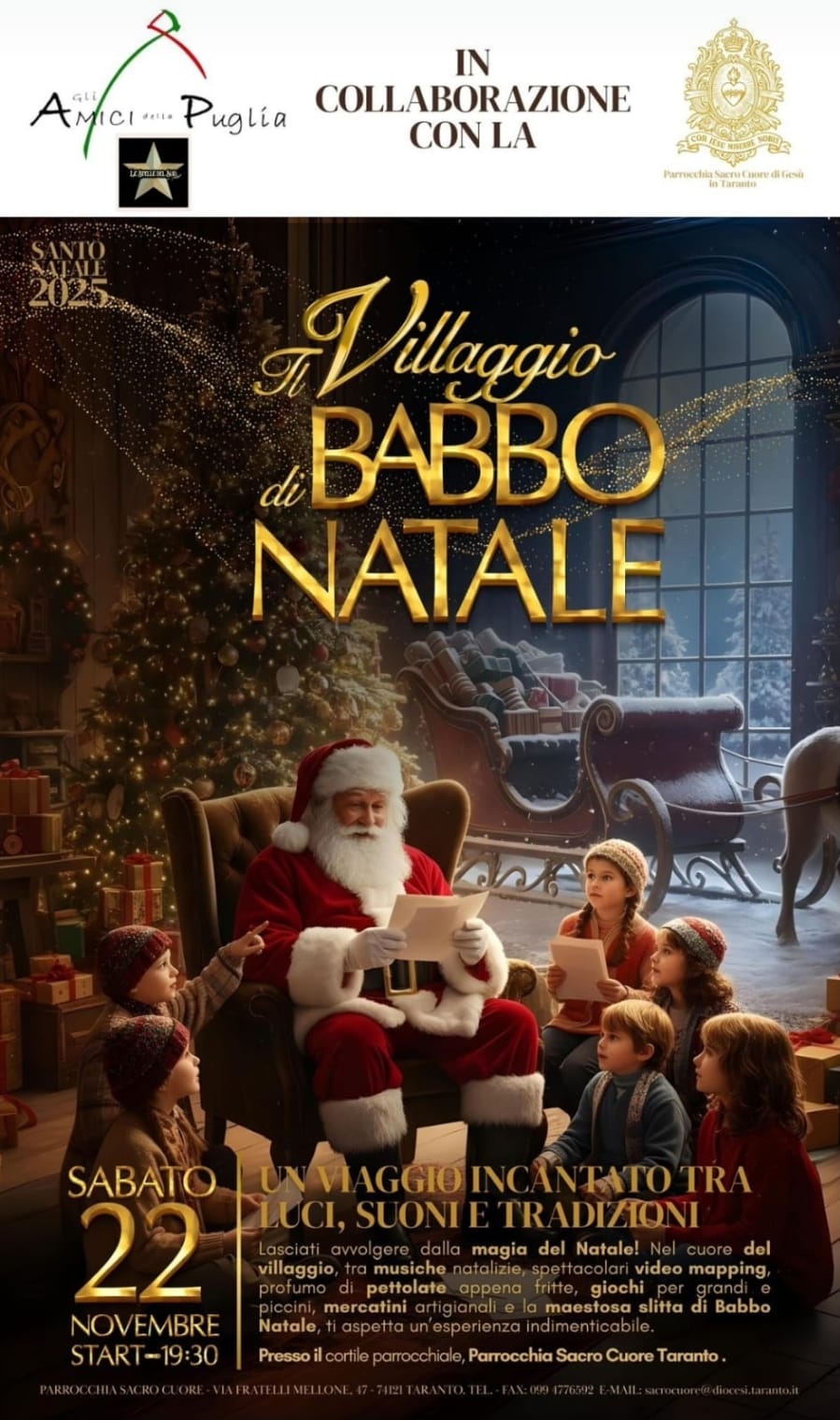 ‘Il villaggio di Babbo Natale’ è la manifestazione che inaugurerà nel cortile della parrocchia del Sacro Cuore, in via Dante a Taranto, il lungo periodo delle festività natalizie, in collaborazione con l’associazione ‘Amici della Puglia’. L’appuntamento è per sabato 22 novembre, ricorrenza di Santa Cecilia, dopo la santa messa delle ore 18.30.