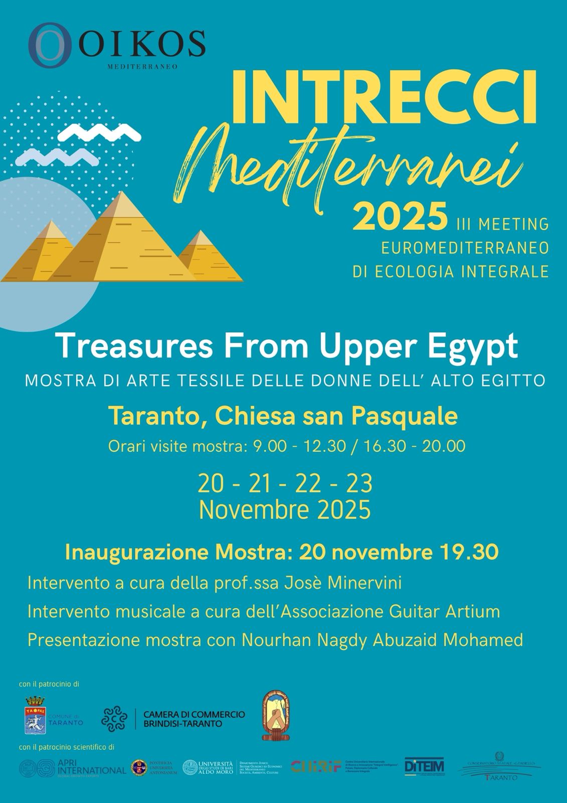 Oikos Mediterraneo, Centro per l’ecologia integrale del Mediterraneo, ha organizzato la III edizione di ‘Intrecci mediterranei’, che si terrà a Taranto dal 20 al 22 novembre, con il patrocinio del Comune di Taranto, e in collaborazione con la Camera di Commercio di Brindisi-Taranto, l’Università degli studi Aldo Moro – Dipartimento jonico, il conservatorio Paisiello, l’Associazione dell’alto Egitto per l’educazione e lo sviluppo, Apri International, la Pontificia Università Antonianum, il Cuirif e il Diteim. I temi di questa nuova edizione saranno le donne, la pace e i giovani.