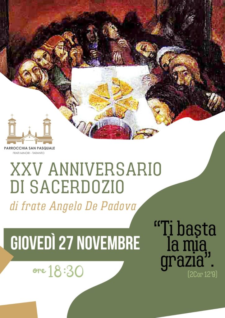 Giovedì 27 nella chiesa di San Pasquale, a Taranto, frate Angelo De Padova alle ore 18.30 celebra la santa messa per i 25 anni di sacerdozio vissuti tra servizio, missione e misericordia. Per l’anniversario egli ha scelto come immagine il Buon Samaritano, identificandosi con l’asino che porta il ferito alla locanda: “Sono quell’asinello che il Signore usa per portare salvezza e cura”, afferma con semplicità. Si tratta di una sintesi perfetta di un cammino vissuto con umiltà, dedizione e cuore aperto a ogni persona incontrata sul suo sentiero.