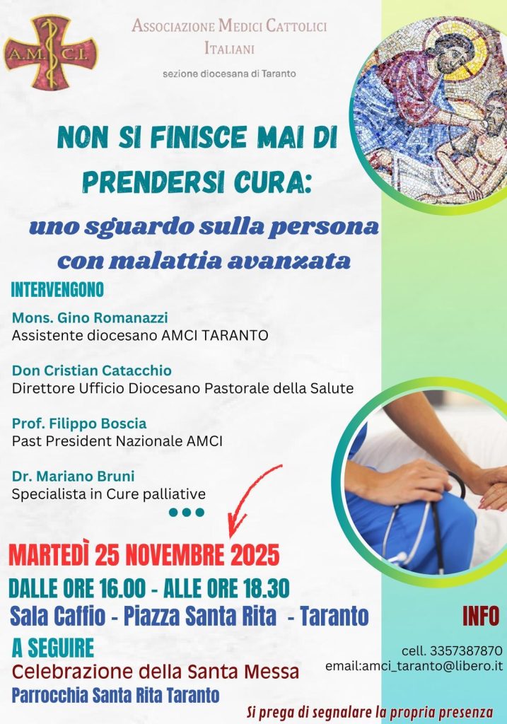 Il 25 novembre scorso, nella parrocchia Santa Rita, si è svolto un incontro coinvolgente promosso dall’Amci (Associazione medici cattolici italiani) di Taranto dal tema “Non si finisce mai di prendersi cura. Uno sguardo sulla persona con malattia avanzata”.