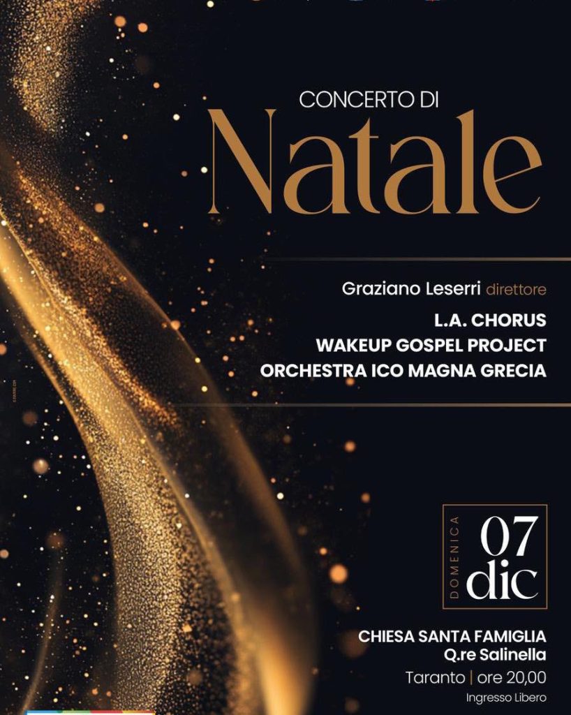 Appuntamento imperdibile quello della vigilia dell’Immacolata, domenica 7 dicembre, alla parrocchia della Santa Famiglia, al quartiere Salinella. Alle ore 20, infatti, sarà in scena il ‘Wakeup Gospel Project’ con il bellissimo e suggestivo repertorio gospel per un indimenticabile ‘Concerto di Natale’, a cura di Comune e Regione Puglia. Il gruppo martinese sarà accompagnato dall’orchestra della Magna Grecia, diretti entrambi dal m° Gaziano Leserri. Ingresso libero.