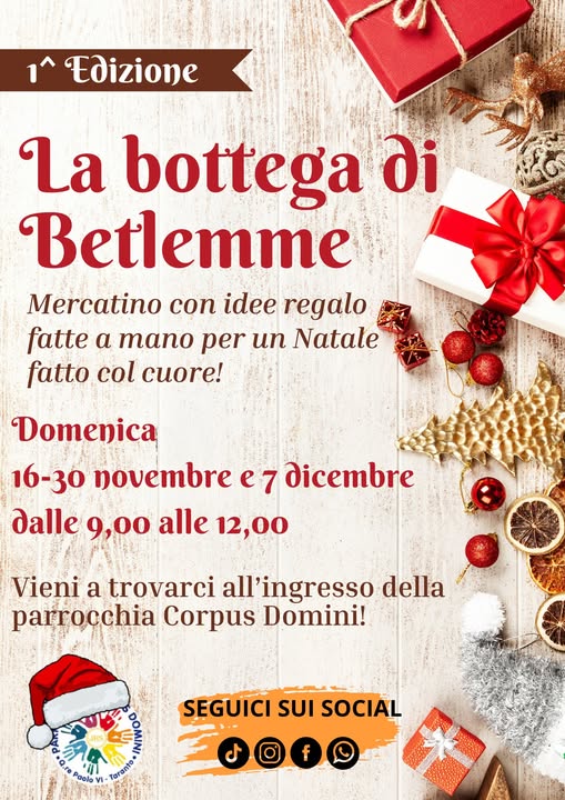 Domenica 7 dicembre, dalle ore 9 alle ore 12, all’ingresso della parrocchia Corpus Domini (quartiere Paolo VI) sarà realizzata la ‘Bottega di Betlemme’ con alcuni stand dove saranno presenti creazioni artigianali perfette per i regali di Natale.