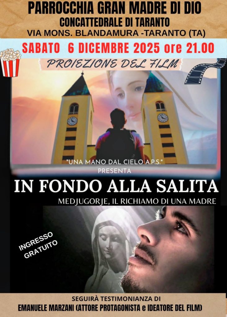 Serata mariana sabato 6 dicembre in Concattedrale, subito dopo le ordinazioni sacerdotali: alle ore 21, sarà proiettato il film ‘In fondo alla salita: Medjugorje, il richiamo di una madre’ prodotto da ‘Una mano dal Cielo aps’. Seguirà la testimonianza di Emanuele Marzani, ideatore del film e attore protagonista.