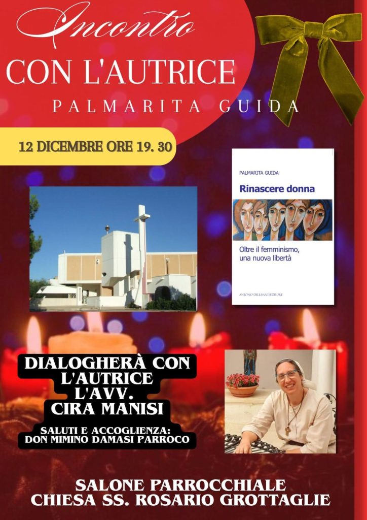 Venerdì 12 dicembre alle ore 19.30 nel salone della parrocchia Maria ss.ma del Rosario di Grottaglie (viale dello sport, 6) il parroco don Mimino Damasi invita all’incontro con suor Palmarita Guida sui temi del suo ultimo libro intitolato ‘Rinascere donna – Oltre il femminismo, una nuova libertà’ (Antonio Dellisanti editore). Dialogherà con l’autrice l’avv. Cira Manisi.