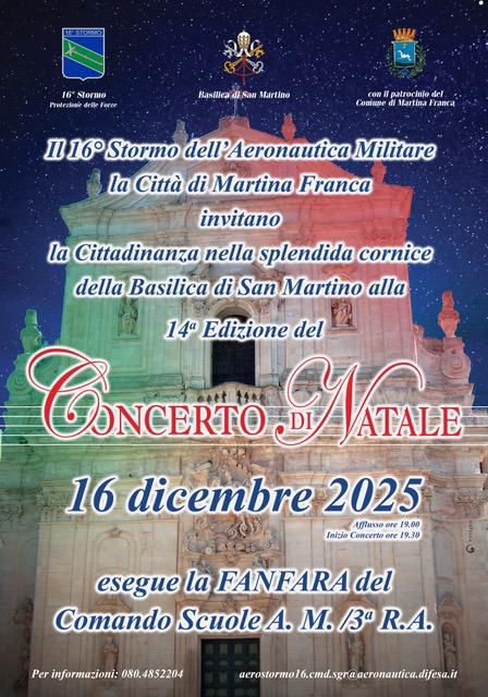 Martedì 16 dicembre a Martina Franca il ‘Concerto di Natale’ nella basilica di San Martino sarà tenuto dalla Fanfara del comando scuole Aeronautica Militare – 3 Regione aerea, diretto dal 1° Lgt m° Nicola Cotugno.