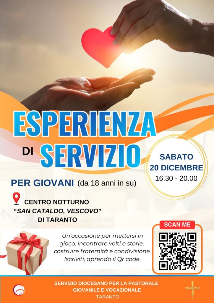 Il Servizio diocesano per la pastorale giovanile e vocazionale, come ogni anno, promuove una proposta rivolta a giovani dai 18 anni in su: un’esperienza di servizio al centro notturno ‘San Cataldo vescovo’ di Taranto, realtà che da anni accoglie persone in difficoltà offrendo ascolto, sostegno e vicinanza concreta. L’iniziativa si terrà sabato 20 dicembre dalle ore 16.30 alle ore 20 e nasce dal desiderio di accompagnare i giovani a conoscere da vicino situazioni di fragilità, favorire l’incontro con storie e volti spesso invisibili delle nostre città e promuovere uno stile di fraternità evangelica vissuta attraverso gesti semplici ma significativi. Sono previsti momenti di accoglienza, servizio, dialogo e condivisione insieme agli operatori del centro e ai volontari che quotidianamente animano questa realtà. Per partecipare è necessaria l’iscrizione tramite registrazione al link: