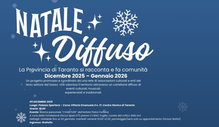 ‘Natale Diffuso’. Così la Provincia di Taranto si racconta e fa comunità. Al via in questi giorni un cartellone diffuso che coinvolge decine di associazioni e operatori culturali. «Non è solo un progetto, ma un appello che arriva al cuore del nostro territorio» dicono Fabrizio Iurlano e Gaia Silvestri, rispettivamente coordinatore e vicecoordinatore rete dal basso di associazioni culturali ed enti del terzo settore. «È il momento che tutte le realtà culturali, che da anni operano con passione e dedizione, si uniscano sotto una stessa visione di sviluppo, condividendo obiettivi comuni e facendo fronte comune per il bene di Taranto e della sua provincia. Occorre una vera e propria rivoluzione culturale, sociale e turistica, una visione che veda nella cultura non solo un elemento di identità, ma anche uno strumento di crescita economica, di coesione sociale e di attrazione turistica. Le associazioni culturali, che rappresentano il motore pulsante della vita locale, sono chiamate a un impegno nuovo e congiunto: progettare insieme il territorio, unire le forze per disegnare un futuro che non solo celebri le tradizioni, ma che crei anche nuove opportunità per le generazioni future. Le realtà culturali, insieme agli enti del terzo settore, sono l’elemento fondamentale per trasformare questa visione in realtà. Il progetto Natale Diffuso è solo l’inizio di un percorso che dovrà portare a una trasformazione duratura e profonda del nostro territorio. Solo mettendo in comune le nostre competenze e risorse, possiamo davvero pensare a una Taranto che sia punto di riferimento culturale, non solo per la Puglia, ma per l’intero panorama nazionale e internazionale».