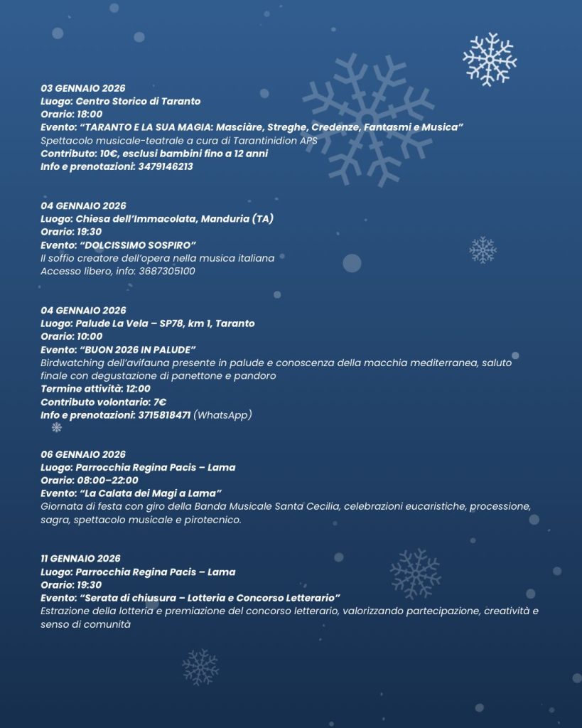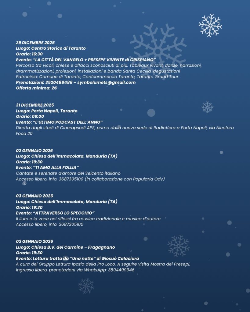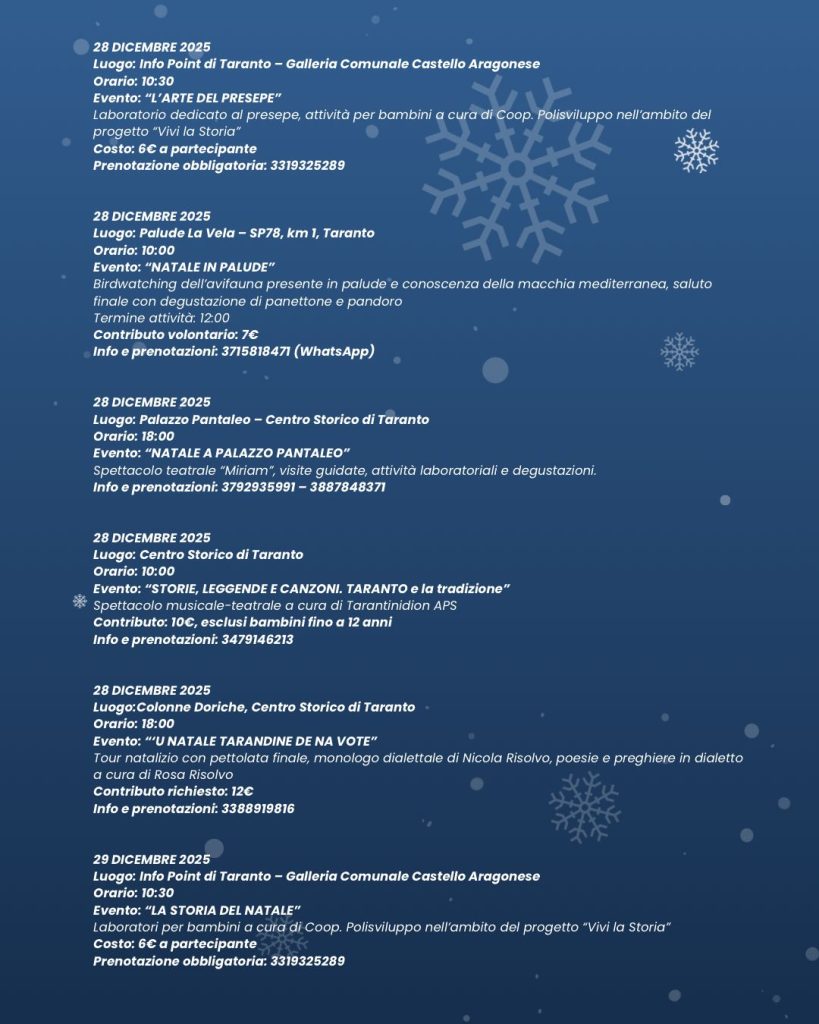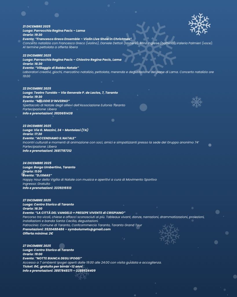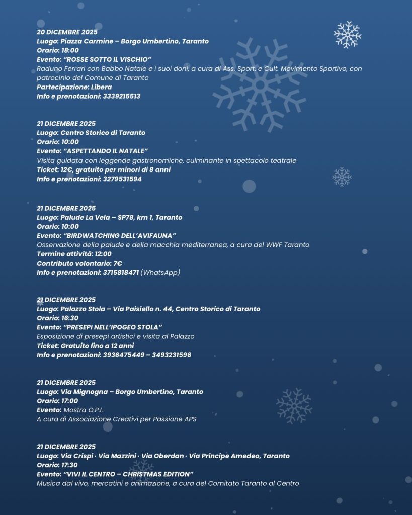 Gli appuntamenti, la maggior parte gratuiti, andranno avanti sino al mese di gennaio. Tra le prime date da segnare in agenda: venerdì 19 a Massafra alle ore 18 (a Casa in Metamorfosi) la presentazione del libro di Giandomenico Crapis, “La democrazia non è un talkshow”, a San Giorgio Jonico “Antichi mestieri in bicicletta” (dalle 18 alle 21 alla scuola elementare M. Nesca), il 20 dicembre il percorso dell’antica via di Santa Lucia (ore 9:45, ingresso ospedale militare), in piazza Carmine (ore 18) “Rose sotto il vischio” con Ferrari e Babbo Natale, alle 20 a Palazzo Galeota il Concerto di Natale. Il 21, nel centro storico, “Aspettando il Natale” con leggende e visita guidata alle 10 e, in via Mignogna, la mostra Opi con inaugurazione alle 17. Nella stessa giornata, al mattino, la Palude La Vela ospiterà un’attività di birdwatching dell’avifauna, mentre dalle 17:30 via Crispi, via Mazzini, via Oberdan e via Principe Amedeo ospiteranno musica dal vivo, animazione e mercatini. Sempre il 21, dalle 16:30, “Presepi nell’ipogeo Stola” e allo stesso orario nella parrocchia Regina Pacis di Lama il Villaggio di Babbo Natale. A seguire il concerto di Francesco Greco Ensemble.