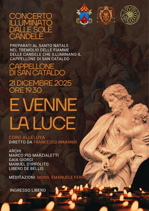 “Preparati al Santo Natale nel tremolìo delle fiamme delle candele che illuminano il cappellone di San Cataldo”, è l’invito del parroco della basilica cattedrale di San Cataldo, mons. Emanuele Ferro, ad assistere al concerto che si terrà domenica 21 dicembre alle ore 19.30 nel cappellone di San Cataldo dal titolo ‘E venne la luce’. Si esibirà il coro ‘Alleluja’ diretto dal m° Francesco Marani, accompagnato dall’ensemble d’archi composto dai maestri Marco Pio Marzialetti, Gaia Giorgi, Manuel D’Ippolito e Libero De Bellis.