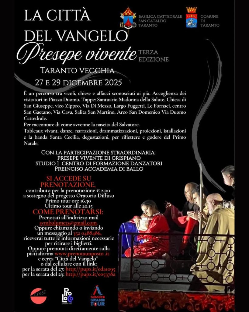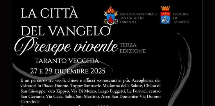 Si terrà il 27 e il 29 dicembre ‘La città del Vangelo’, terza edizione Presepe vivente, a cura della basilica cattedrale San Cataldo inserita all’interno della manifestazione del Comune ‘Natale Diffuso’. Si tratta di un percorso tra vicoli chiese e affacci sconosciuti ai più per raccontare come avvenne la nascita del Salvatore attraverso tableaux vivant, danze, narrazioni, drammatizzazioni, proiezioni, istallazioni, e musiche della banda Santa Cecilia, degustazioni, per riflettere e godere del Primo Natale. L’evento itinerante vede anche la partecipazione straordinaria del Presepe vivente di Crispiano, Studio 1 Centro formatori danzatori, Preinciso accademia di ballo.