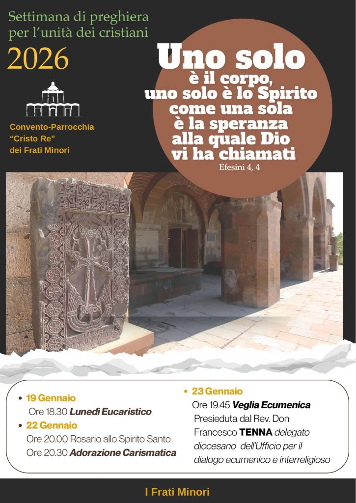 Anche quest’anno a Martina Franca la comunità parrocchiale di Cristo Re, affidata ai frati francescani minori, si unisce alla preghiera della Chiesa universale per invocare dal Signore il dono dell’unità tra tutti i cristiani, nella settimana ad essa dedicata sul tema ‘𝐔𝐧𝐨 𝐬𝐨𝐥𝐨 𝐞̀ 𝐢𝐥 𝐜𝐨𝐫𝐩𝐨 𝐞 𝐮𝐧𝐨 𝐬𝐨𝐥𝐨 𝐞̀ 𝐥𝐨 𝐒𝐩𝐢𝐫𝐢𝐭𝐨, 𝐜𝐨𝐦𝐞 𝐮𝐧𝐚𝐬𝐨𝐥𝐚 𝐞̀ 𝐥𝐚 𝐬𝐩𝐞𝐫𝐚𝐧𝐳𝐚 𝐚𝐥𝐥𝐚 𝐪𝐮𝐚𝐥𝐞 𝐃𝐢𝐨 𝐯𝐢 𝐡𝐚 𝐜𝐡𝐢𝐚𝐦𝐚𝐭𝐢’ (Ef 4,4).