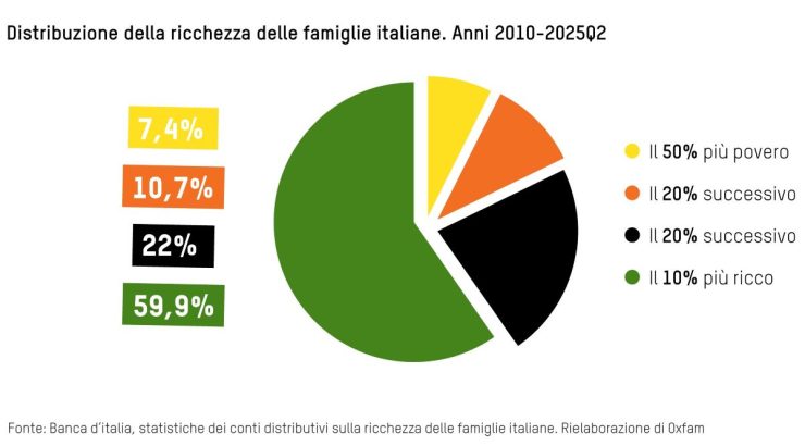 Pochissimi ricchi sempre più esageratamente ricchi, moltissimi poveri (quasi la metà della popolazione mondiale), sempre più poveri. Quello che accade a livello globale accade anche in Italia: nel 2025 i miliardari italiani, ossia 79 individui (erano 71 nel 2024) hanno aumentato il loro patrimonio di 54,6 miliardi di euro (al ritmo di 150 milioni al giorno), raggiungendo 307,5 miliardi. Il 10% più ricco delle famiglie italiane possiede oltre 8 volte la ricchezza della metà più povera, contro poco più di 6 volte nel 2010. Dal 2010 al 2025 la ricchezza nazionale è cresciuta di oltre 2.000 miliardi, ma il 91% di questo incremento è andato al 5% più ricco, mentre la metà più povera ha ottenuto appena il 2,7% e perciò è sempre più povera. Oggi il top 5% degli italiani detiene il 49,4% della ricchezza nazionale, quasi il 17% in più di quanto possiede il 90% più povero.