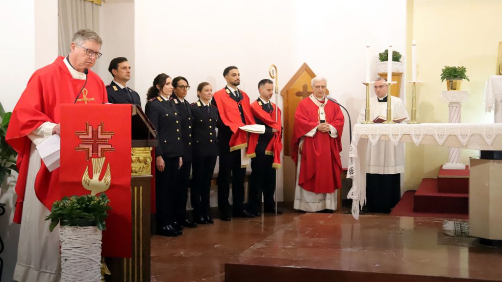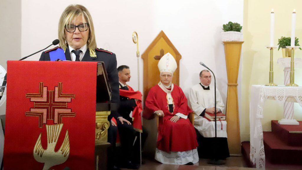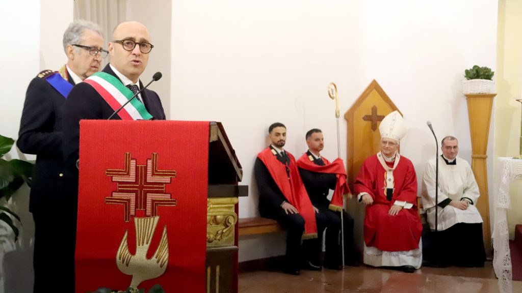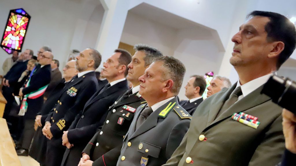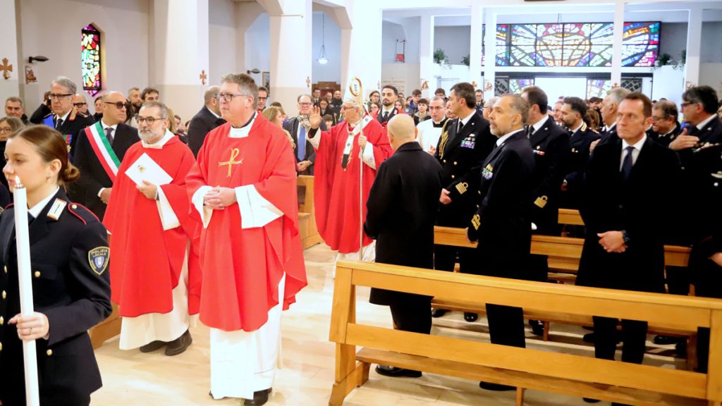 A lato del presbiterio, il gonfalone del Comune, con un sottufficiale della Marina Militare che ha sottolineato con gli squilli di tromba i momenti più significativi della celebrazione, cui hanno collaborato al servizio d’altare alcuni membri della polizia locale.