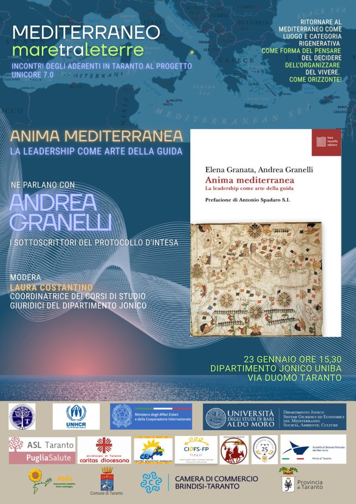 Venerdì 23 gennaio, a partire dalle ore 15:30 al dipartimento jonico Uniba, in via Duomo 259, Andrea Granelli – coautore con Elena Granata di Anima mediterranea. La leadership come arte della guida (Luca Sossella editore), sarà a Taranto in un incontro-seminario aperto alla città. “Un’anima, quella mediterranea, che va ri-appresa in una paideia, in un itinerario di pensiero critico e di azioni costruttive”, scrivono gli autori.