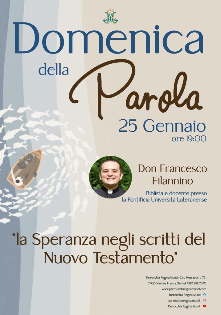 Per la ‘Domenica della parola’, questa domenica, 25 gennaio, alla parrocchia regina Mundi di Martina Franca, alle ore 19, don Francesco Filannino, biblista e docente alla Pontificia Università Lateranense, relazionerà sul tema ‘La speranza negli scritti del Nuovo Testamento’.