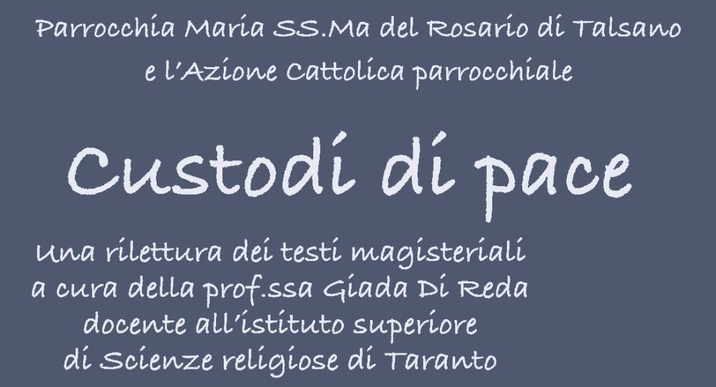 ‘Custodi di pace’: questo è il tema dell’incontro che si svolgerà sabato 31 gennaio, a partire dalle ore 19.30, nella chiesa del Rosario di Talsano.