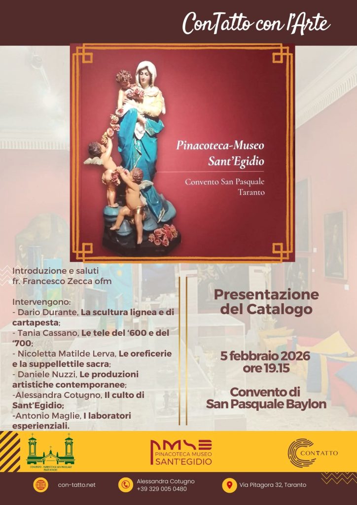 Giovedì 5 febbraio a Taranto nella chiesa di San Pasquale Baylon dei frati francescani minori, l’associazione ‘Contatto con l’Arte’ terrà la presentazione del catalogo delle opere esposte nella pinacoteca-museo ‘Sant’Egidio’, nei medesimi locali parrocchiali. Dopo l’introduzione di fra Francesco Zecca interverranno: Dario Durante (‘La scultura lignea e di cartapesta’), Tania Cassano (‘Le tele del ‘600 e del ‘700’), Nicoletta Matilde Lerva (‘Le oreficerie e la suppellettile sacra’), Daniele Nuzzi (‘Le produzioni artistiche contemporanee’), Alessandra Cotugno (Il culto di Sant’Egidio’), Antonio Maglie (‘I laboratori esperienziali’).