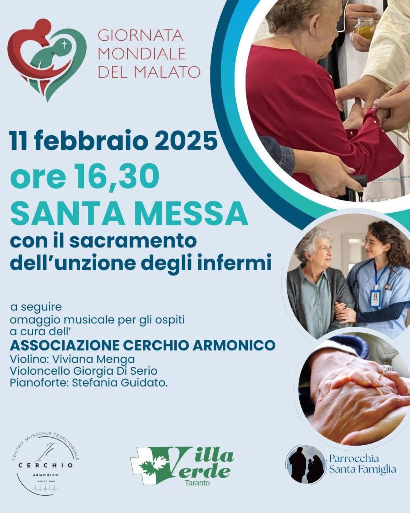 In occasione della Giornata mondiale del malato, mercoledì 11, alla parrocchia della Santa Famiglia (a Taranto, al quartiere Salinella) durante la santa messa delle ore 16.30 il parroco don Alessandro Solare impartirà il sacramento dell’Unzione degli infermi. Seguirà l’omaggio musicale per gli ospiti a cura dell’associazione ‘Cerchio armonico’ (in collaborazione con la ‘Villa verde’) con Viviana Menga al violino, Giorgia Di Serio al violoncello e Stefania Guidato al pianoforte.