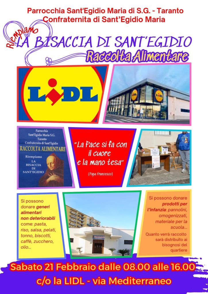 A tal proposito la confraternita di Sant’Egidio Maria di San Giuseppe della omonima parrocchia è impegnata anche in questa Quaresima in una raccolta alimentare per i bisognosi del quartiere Tramontone. Lo farà sabato 21 febbraio  dalle ore 8  alle ore 16 al Supermercato Lidl di via Mediterraneo. Nell’invitare alla generosità, il priore della confraternita, Pino Lippo, così ricorda: “«Tutto quello che avete fatto a uno di questi minimi, l’avete fatto a me», dice il Signore. Seminate dunque la carità di Gesù Cristo con le vostre opere buone e la gioia del dono”.