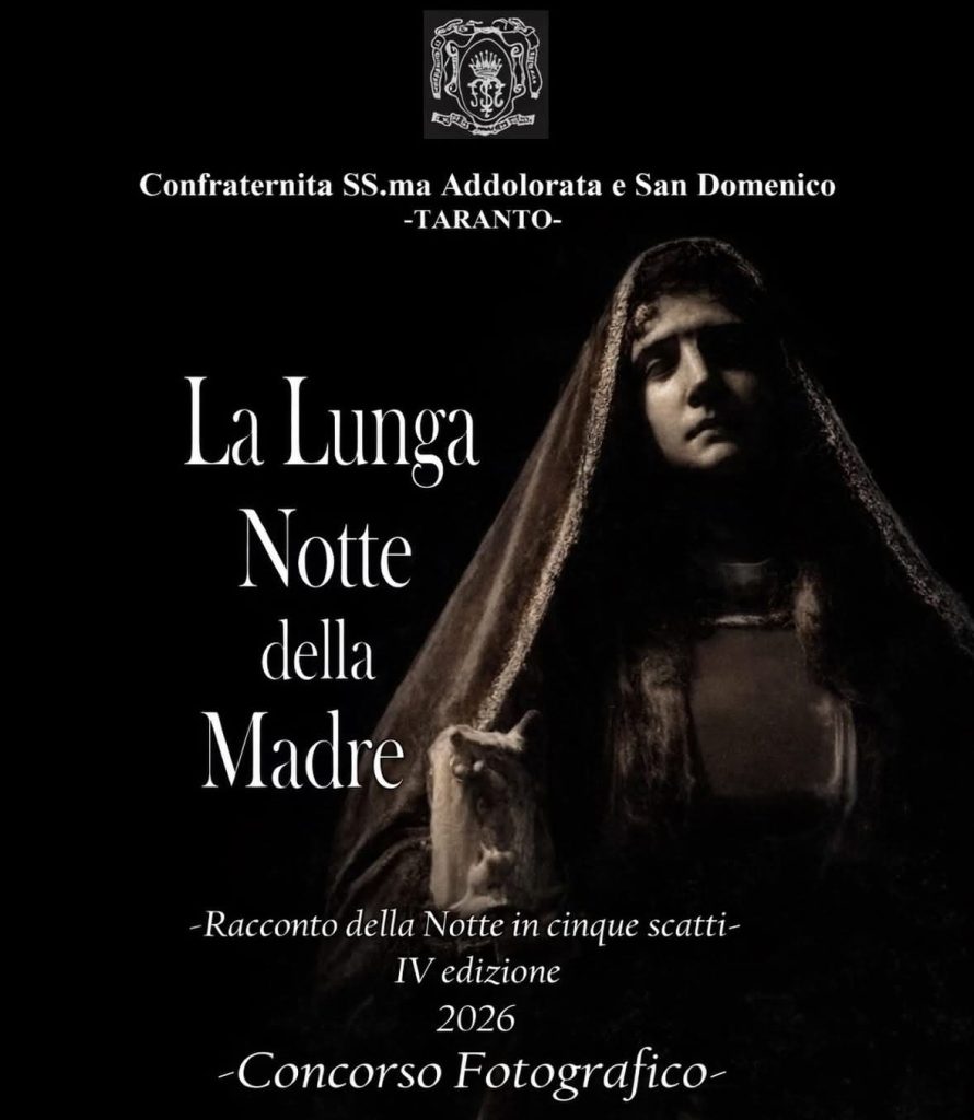 “La lunga notte della Madre: Racconto della ‘Notte’ in cinque scatti” è il titolo della quarta edizione del concorso fotografico dedicato al suggestivo Pellegrinaggio dell’Addolorata, che si svolge dalla notte del Giovedì Santo a Taranto, organizzato dalla confraternita Maria SS. Addolorata e San Domenico.
