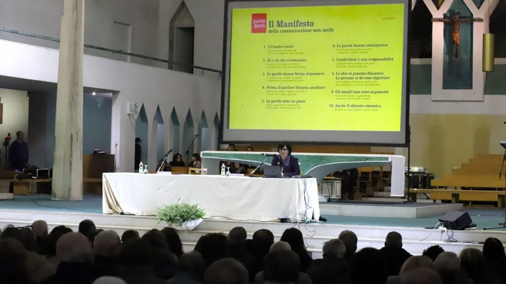 Dopo l’introduzione della serata da parte di mons. Gino Romanazzi, la relatrice è entrata subito nel merito del tema definendosi la “mamma” del ‘Manifesto delle parole non ostili’, nato circa nove anni fa da un incontro tra amici che desideravano migliorare le relazioni online e offline. Il progetto è cresciuto fino a coinvolgere migliaia di persone, aziende, scuole e oltre 400 sindaci, ricevendo anche citazioni da Papa Francesco. Il manifesto consta di 10 principi semplici, scritti in prima persona, per sottolineare l’impegno individuale nel comunicare con consapevolezza.