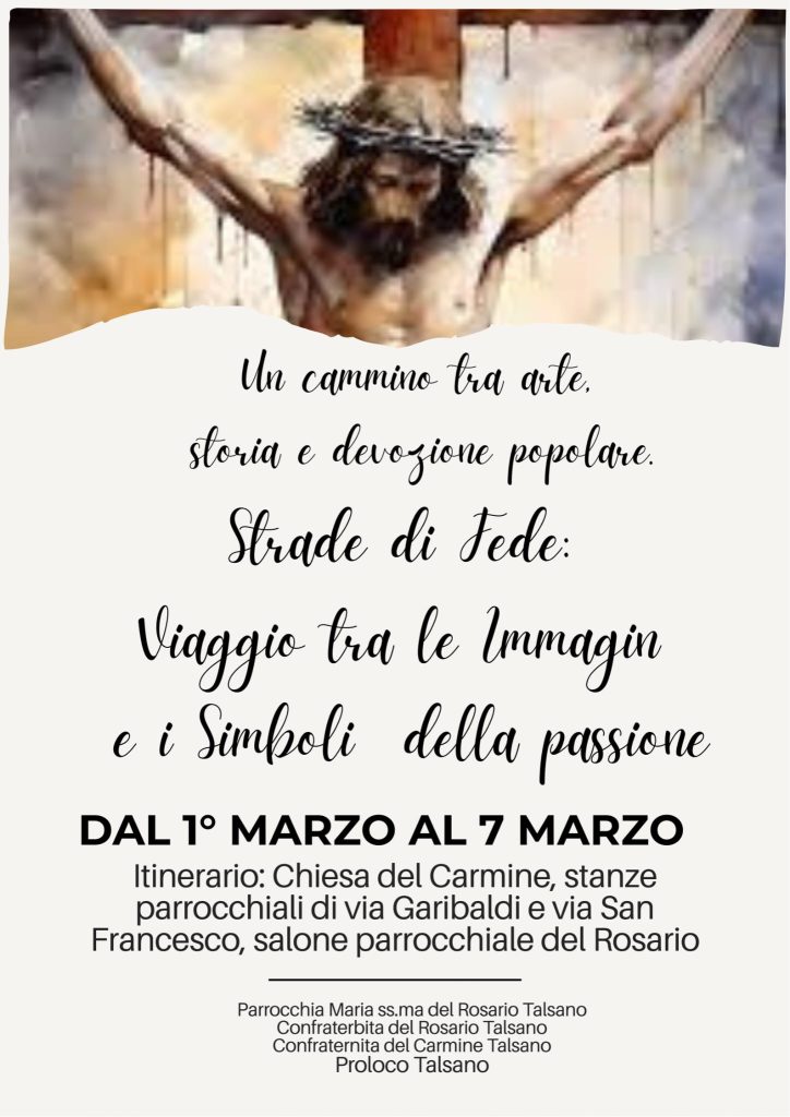 Un cammino tra arte, storia e devozione popolare: sono queste sono le finalità della mostra ‘Strade di fede: viaggio tra le immagini e i simboli della Passione’ che si terrà da domenica 1 a sabato 7 marzo a Talsano, a cura della parrocchia Maria Ss.ma del Rosario, delle confraternite del Rosario e del Carmine e della Proloco talsanese. L’esposizione avverrà nella chiesa del Carmine, nelle stanze parrocchiali in via Garibaldi e via San Francesco e nel salone parrocchiale del Rosario.
