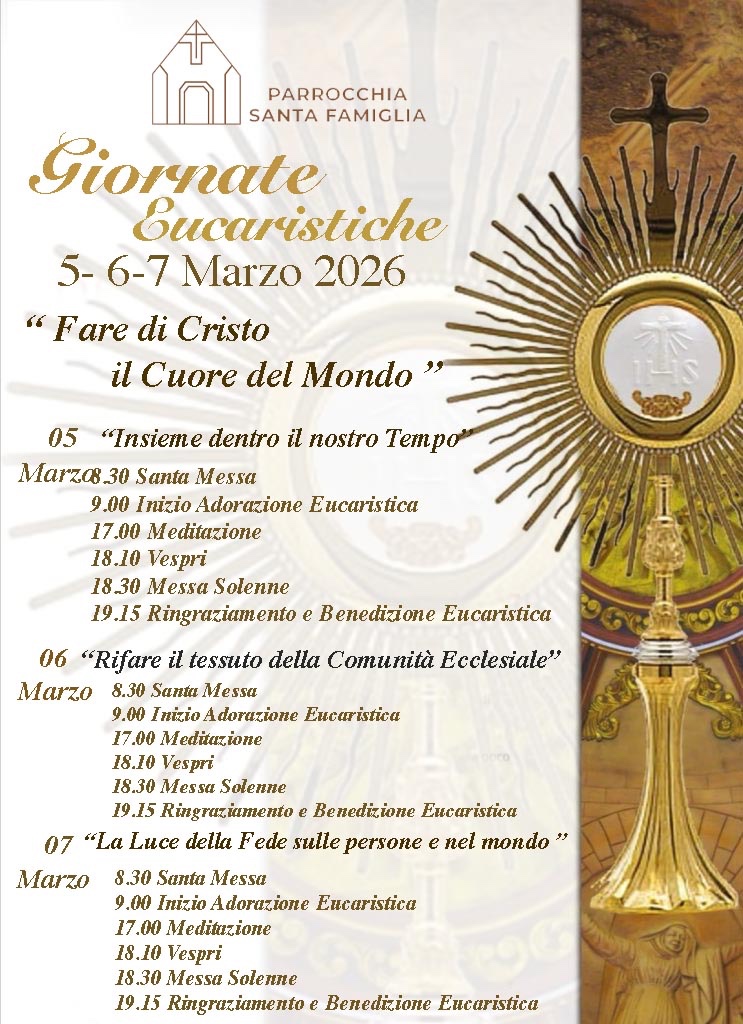 Nei giorni 5, 6 e 7 marzo si terranno nella parrocchia della Santa Famiglia in Martina Franca le ‘Giornate eucaristiche’ dal titolo ‘Fare di Cristo il cuore del mondo’.