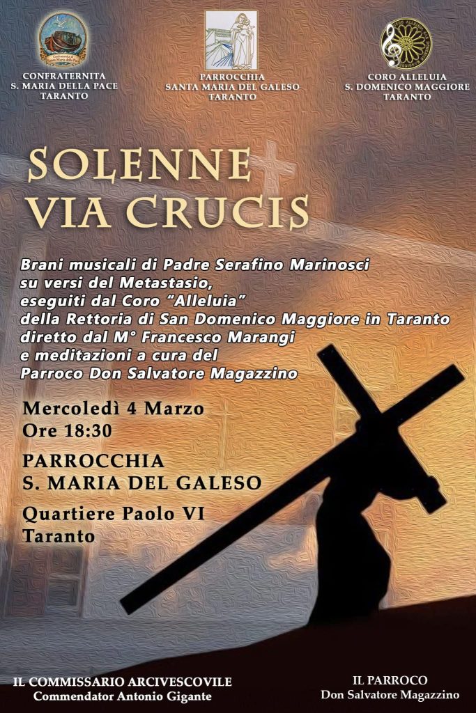 La parrocchia di Santa Maria del Galeso, al quartiere Paolo VI, questa sera, mercoledì 4, alle ore 18.30, terrà la solenne via crucis con i brani composti dal musicista francavillese padre Serafino Marinosci, che saranno eseguiti dal coro ‘Alleluja’ della rettoria di San Domenico, in Taranto.